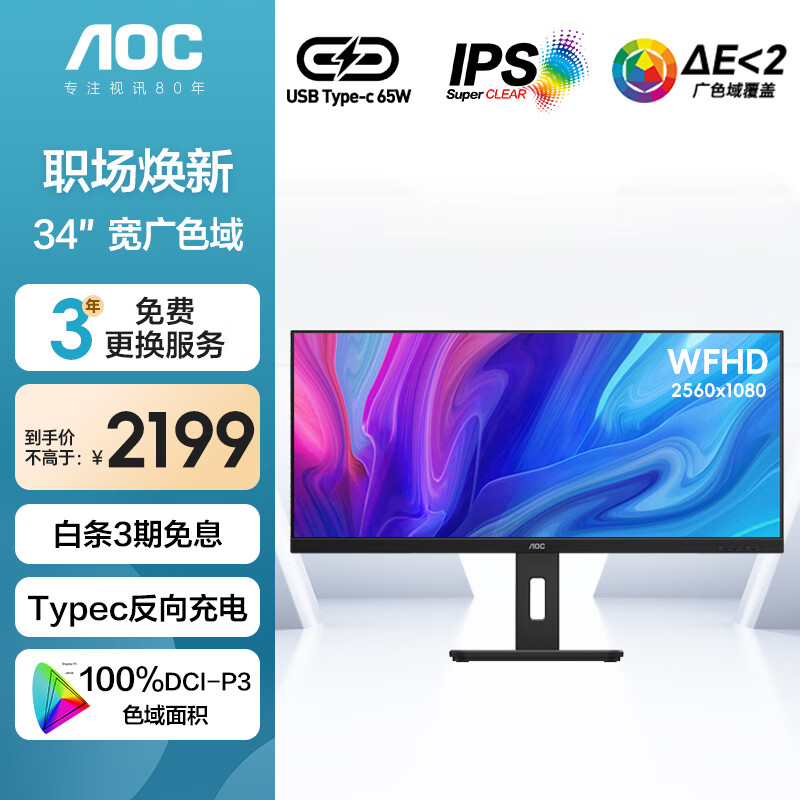 AOC 34英寸 WFHD 21比9带鱼屏 IPS技术 123%sRGB色域 Type-C 65W反向充电 家用办公电脑显示器 Q34P2C价格:2199.00元!