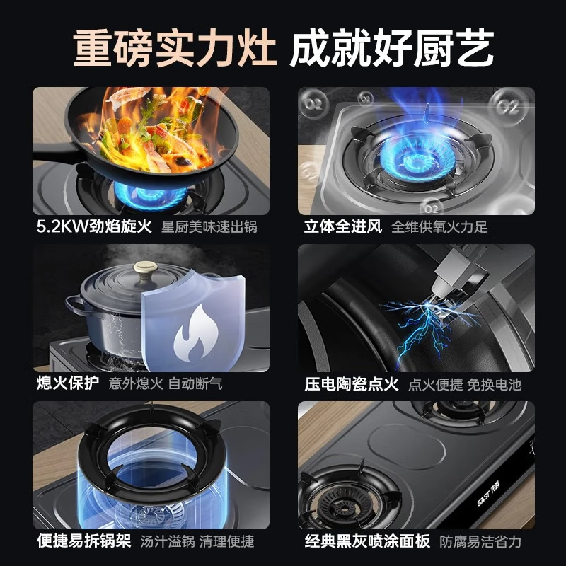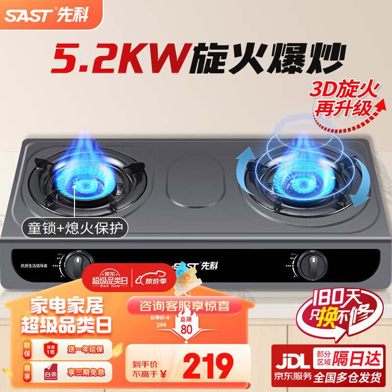 先科(SAST)燃气灶双灶天然气液化气猛火灶家用爆炒灶炉灶炉具台式两种气源可选 (天然气)【顶配款】5.2旋火爆炒+抗油涂层+熄保价格:219.00元!