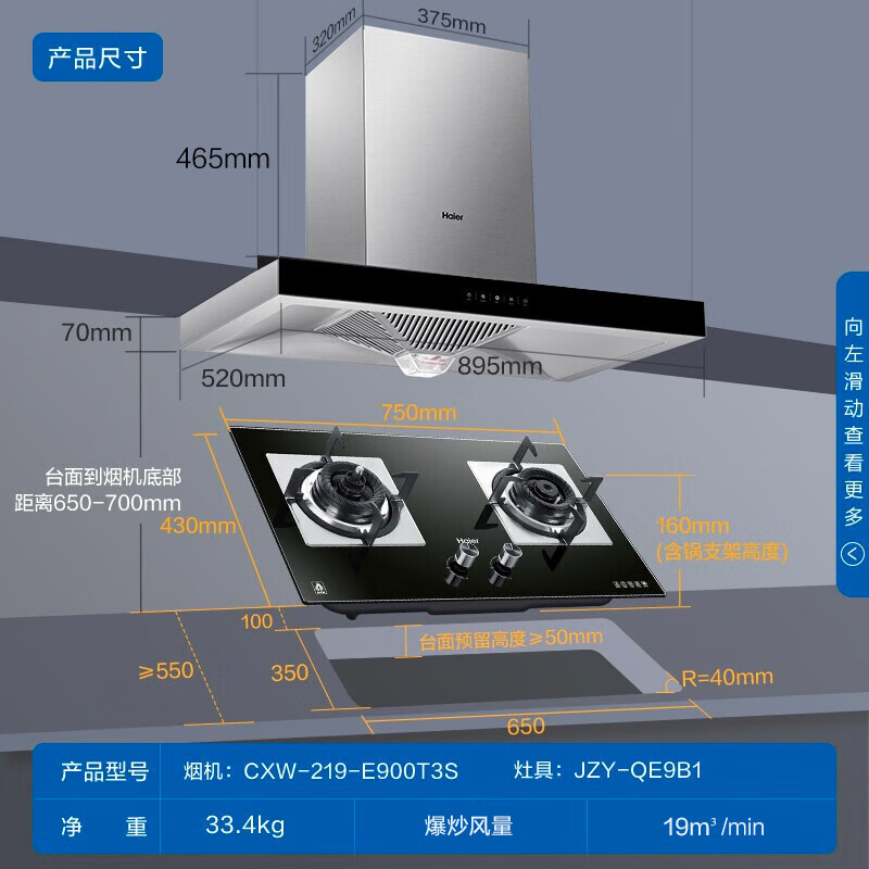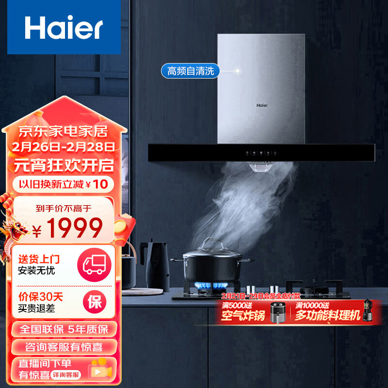 海尔(Haier)抽油烟机 烟灶套装 19m3/min吸力420pa风压高频自旋洗家用欧式5.0kW防干烧T3S+QE9B1(天)价格:1999.00元!