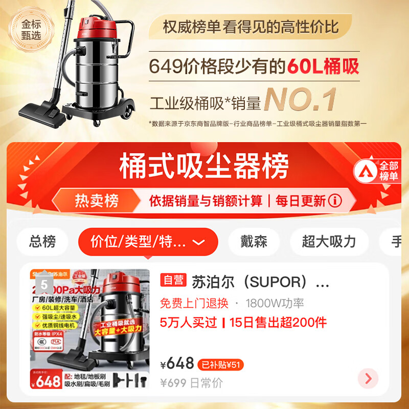 苏泊尔(SUPOR)大功率工业吸尘器工厂车间粉尘大吸力商用大型桶式吸水除尘器装修开荒洗车间保洁EVCB-75S价格:648.00元!