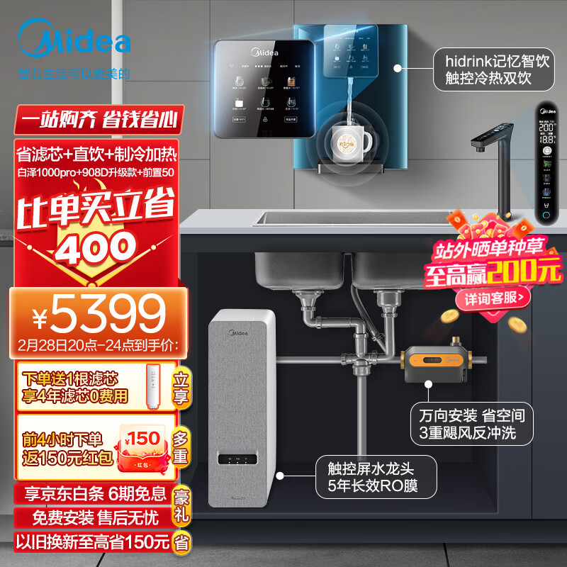 美的(Midea)省芯直饮冷热净水器套装【白泽1000pro+管线机908D+前置-50】家用反渗透 壁挂式加热一体净饮机价格:5399.00元!