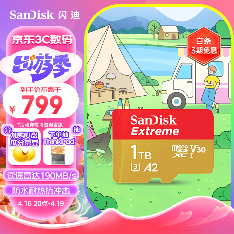 闪迪(SanDisk)A2 1TB TF(MicroSD)存储卡 V30 U3 4K 极速移动版内存卡 读速190MB/s 写速130MB/s价格:799.00元!
