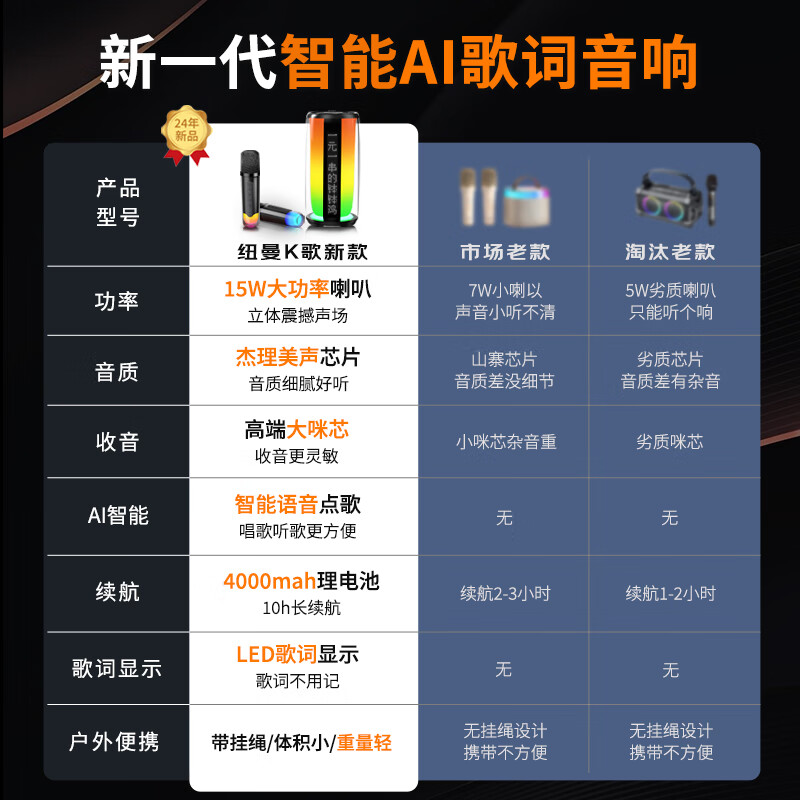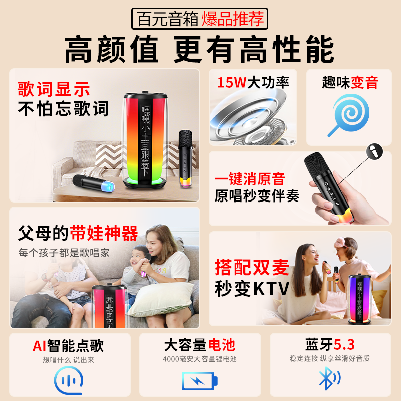 纽曼(Newmine)音响音箱蓝牙唱歌神器K歌麦克风音响一体式内置声卡显示歌词KTV家用便携户外卡拉ok K19 双麦克风价格:299.00元!