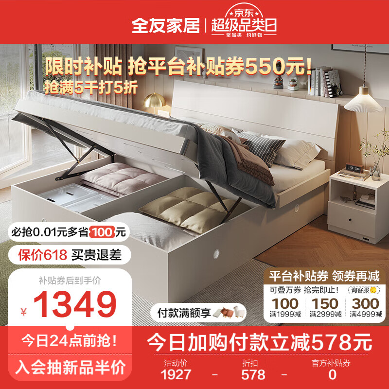 全友家居 床现代简约高箱储物床人体工学床屏大床主卧室家具106302价格:1927.14元!