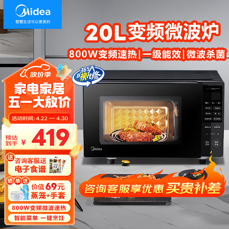 美的 MIDEA变频微波炉 20升大平板底盘 智能菜单 800W变频速热 易清洁内胆 电子除味 PM20M3价格:419.00元!