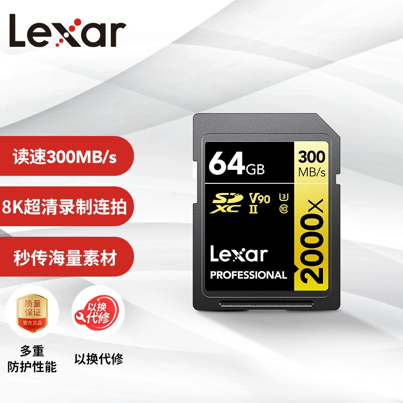 雷克沙(Lexar)64GB SD存储卡 U3 V90 8K视频摄像相机内存卡 读300MB/s 写260MB/s 高速读取录制(2000x)价格:799.00元!