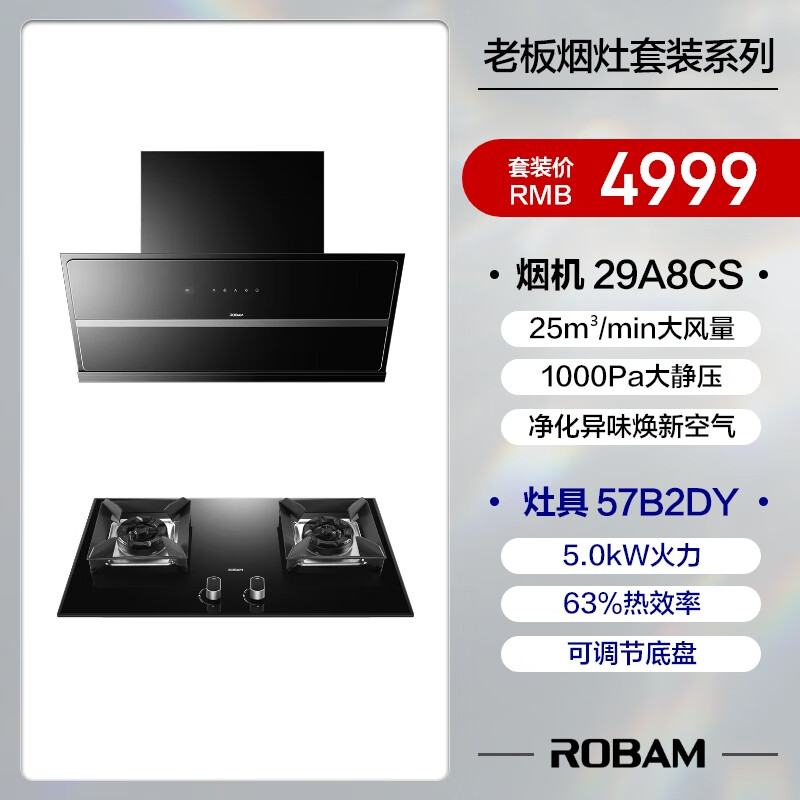 老板(Robam)抽油烟机探索家A8CS智能变频吸油烟机挥手智控家用侧吸25m3/min燃气灶具烟灶套装29A8CS+57B2DY价格:4998.00元!