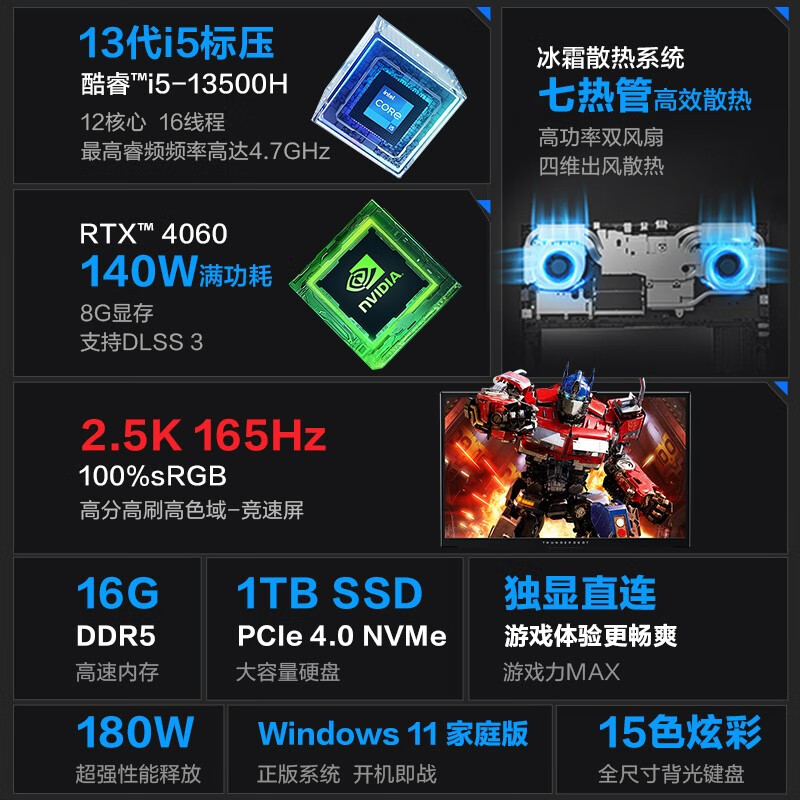 雷神(ThundeRobot)911MT黑武士15.6英寸独显轻薄游戏本骨灰玩家级剪辑AI设计师编程移动工作站笔记本电脑变形金刚IP i5-13500H4060|16G1T擎天柱IP款价格:7699.00元!