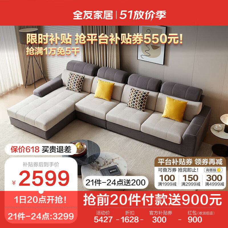全友家居 现代简约布艺沙发客厅家具大户型家用贵妃位转角沙发102251价格:5427.14元!