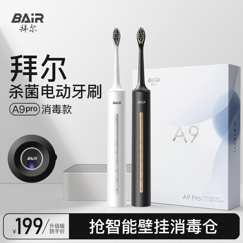 拜尔A9pro 智能杀菌电动牙刷成人声波充电式震动软毛情侣学生党智能自动男女士 送女朋友 曜黑价格:199.00元!