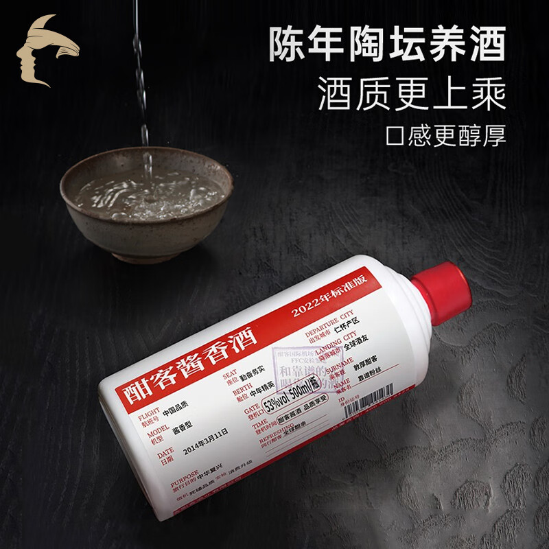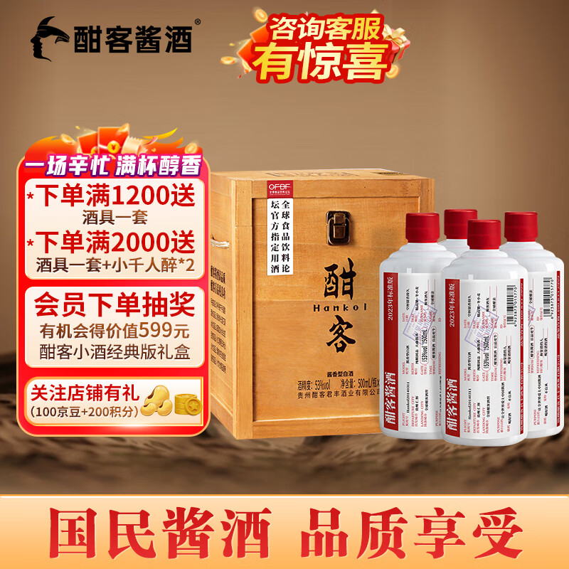 酣客 2023年标准版 酱香型白酒53度大曲 500ml*4瓶 木箱礼盒装价格:1500.80元!