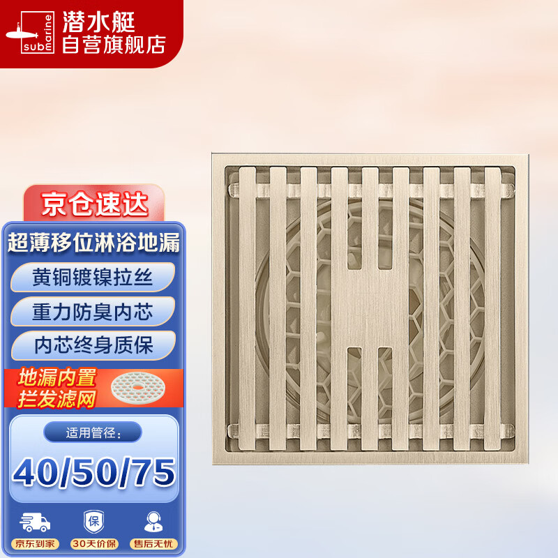 潜水艇(Submarine) LTK40-10黄铜镀镍大排量超薄地漏 奶油风移位淋浴四防地漏40管径价格:128.00元!