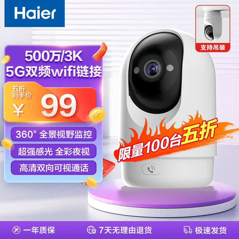 海尔(Haier)摄像头 25系列 家用监控 WiFi 双频室内 手机远程 日夜全彩双向语音智能监控 500万像素 高清【裸机单摄像头】价格:99.00元!