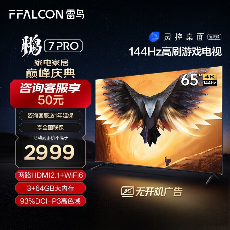 FFALCON雷鸟 游戏电视65英寸鹏7PRO 144Hz高刷 HDMI2.1 3+64GB 4K超高清超薄液晶电视65S575C[黑]价格:2999.00元!