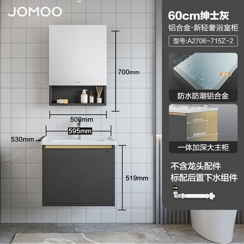 九牧(JOMOO)浴室柜 陶瓷一体盆铝合金悬挂抗菌组合柜绅士灰60cm A2706-715Z-2价格:2099.00元!
