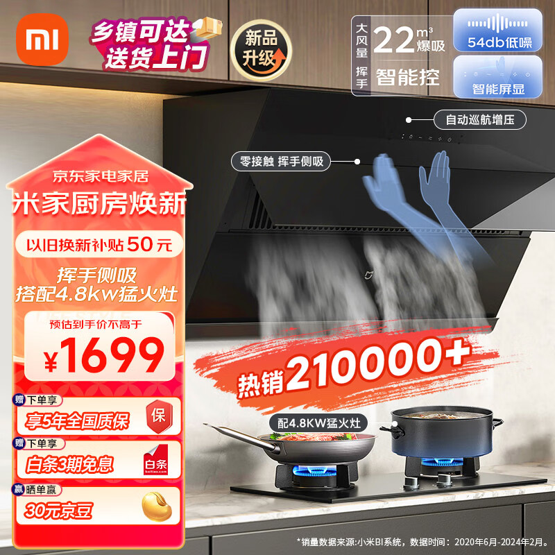 米家小米智能侧吸油烟机S1 22大吸力小尺寸抽油烟机燃气灶套装 手势操控 4.8kW烟灶联动 MJ02C液化气价格:1699.00元!