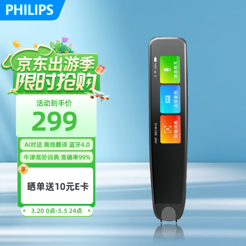 飞利浦(PHILIPS)词典笔VTR5300翻译笔扫描学习机点读笔 AI智能单词笔 小学初高中英语电子辞典 查词神器 黑色价格:299.00元!