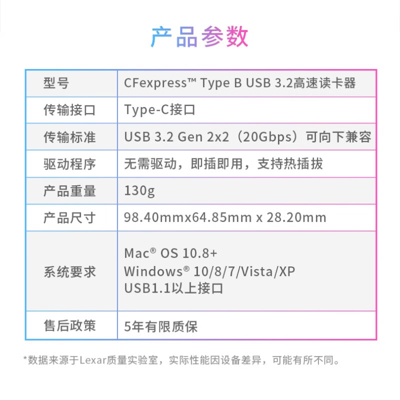 雷克沙(Lexar)USB 3.2高速读卡器 CFexpress Type B存储卡读卡器550U 8K素材20Gbps传输 Type-C接口价格:599.00元!