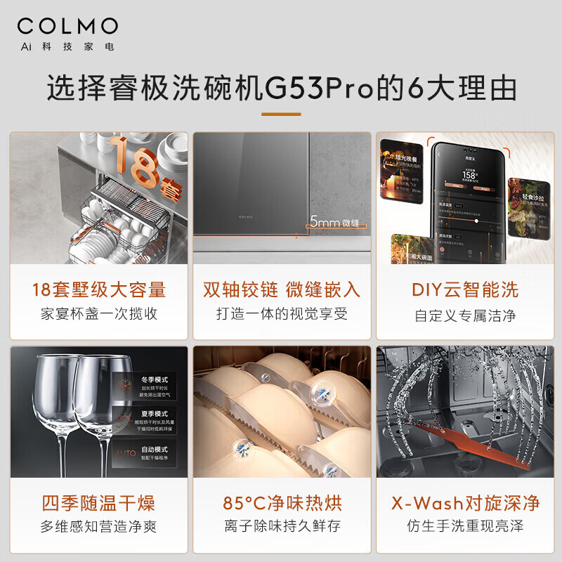 COLMO【睿极】18套大容量自定义面板洗碗机 创新双轴铰链设计宽缝变微缝 独立烘存刷碗机G53Pro价格:9499.00元!