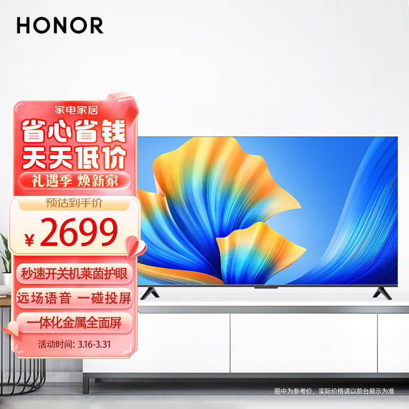 荣耀智慧屏X3 65英寸 金属屏 4K超清广色域 智能电视 远场语音 一碰投屏 莱茵双重护眼 HN65DNTS价格:2699.00元!