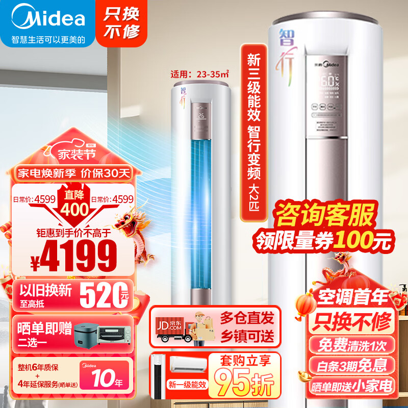 美的(Midea)空调柜机 2匹 智行 变频冷暖 圆柱立柜式空调 APP控制 以旧换新 KFR-51LW/BDN8Y-YA400(3)A价格:4199.00元!