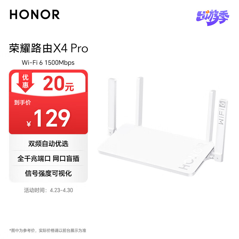 荣耀(HONOR)路由X4 Pro WiFi6路由器 双千兆 高速率 低时延 游戏网课加速 mesh 信号可视 家长路由价格:149.00元!