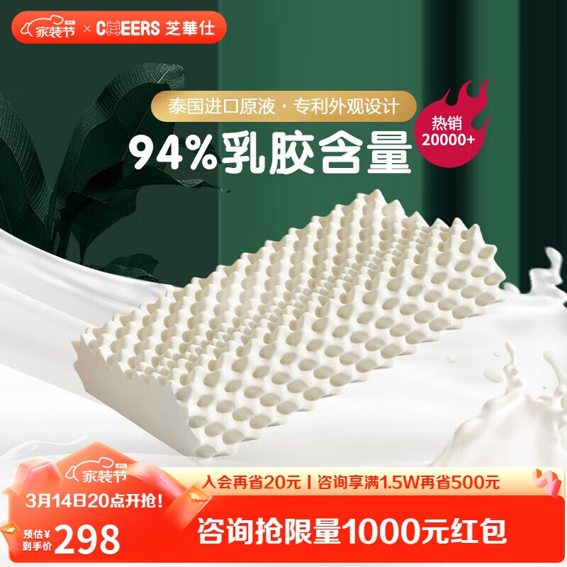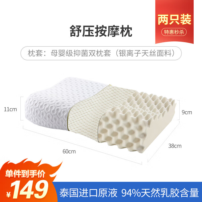 芝华仕(CHEERS)乳胶枕头人体工学天然橡胶枕成人枕芯 舒压按摩枕&2价格:298.00元!
