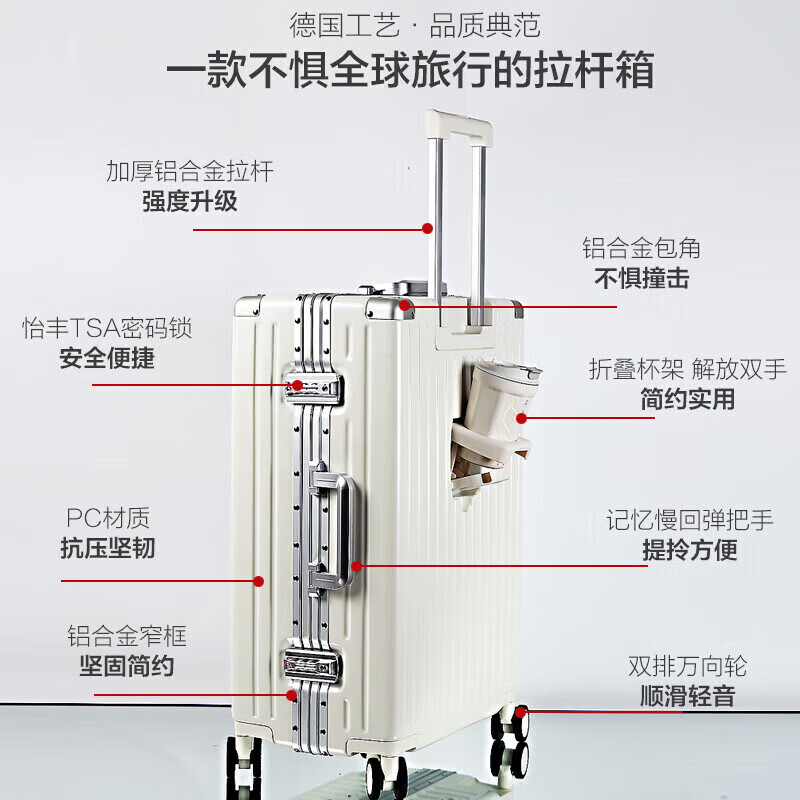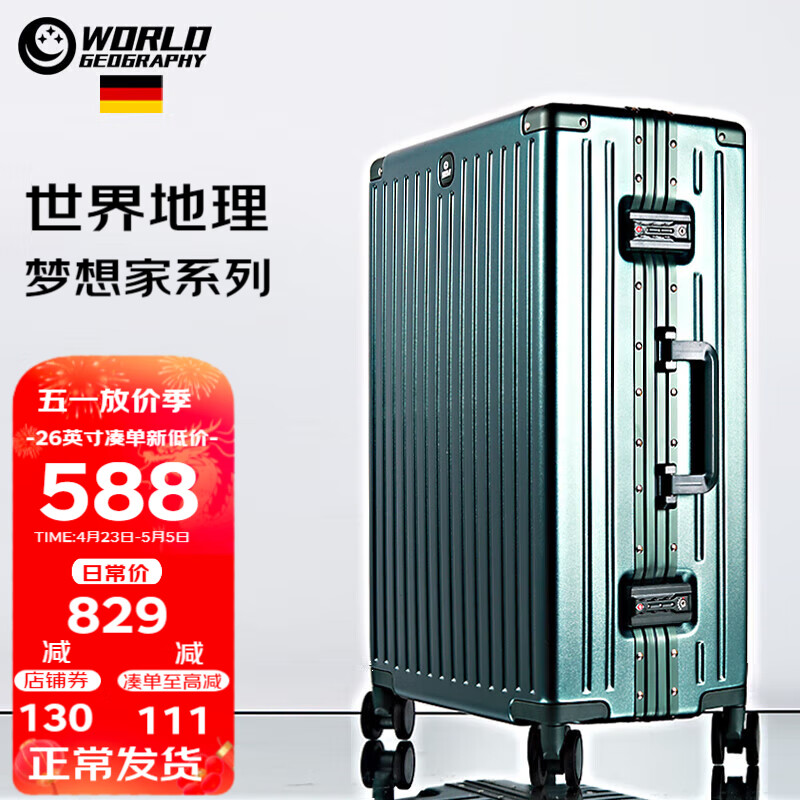 地理德国行李箱男女26英寸铝框旅行箱杯架拉杆箱万向轮密码箱 英伦绿价格:829.00元!