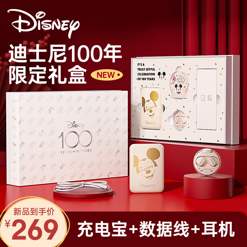 迪士尼(DISNEY)【100周年经典礼盒】蓝牙耳机+无线充电宝+三合一充电线三件套送男女生表白生日礼物QS-L01价格:299.00元!
