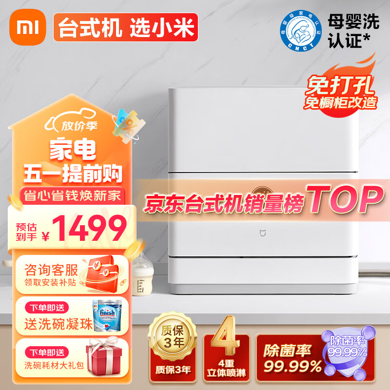 米家小米洗碗机 5套台式母婴家用小型刷碗机台面式易安装高温除菌超薄存储智能WiFi操控S1价格:1499.00元!