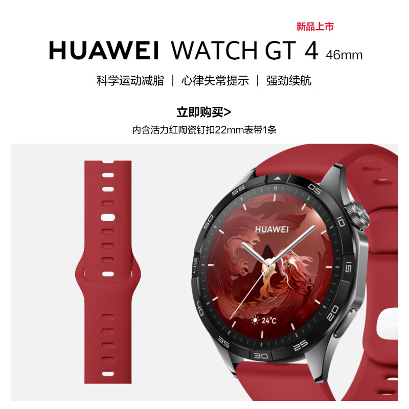 【新年活力红腕带套装】华为 WATCH GT4(46mm)曜石黑黑色氟橡胶+活力红陶瓷钉扣表带价格:1568.00元!