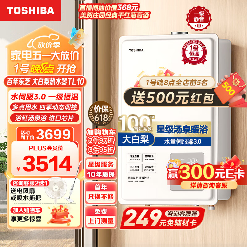 东芝(TOSHIBA)16升燃气热水器 天然气水伺服 3D恒温 进口CPU 下置变频风机 一级静音 大白梨TL10价格:3999.00元!