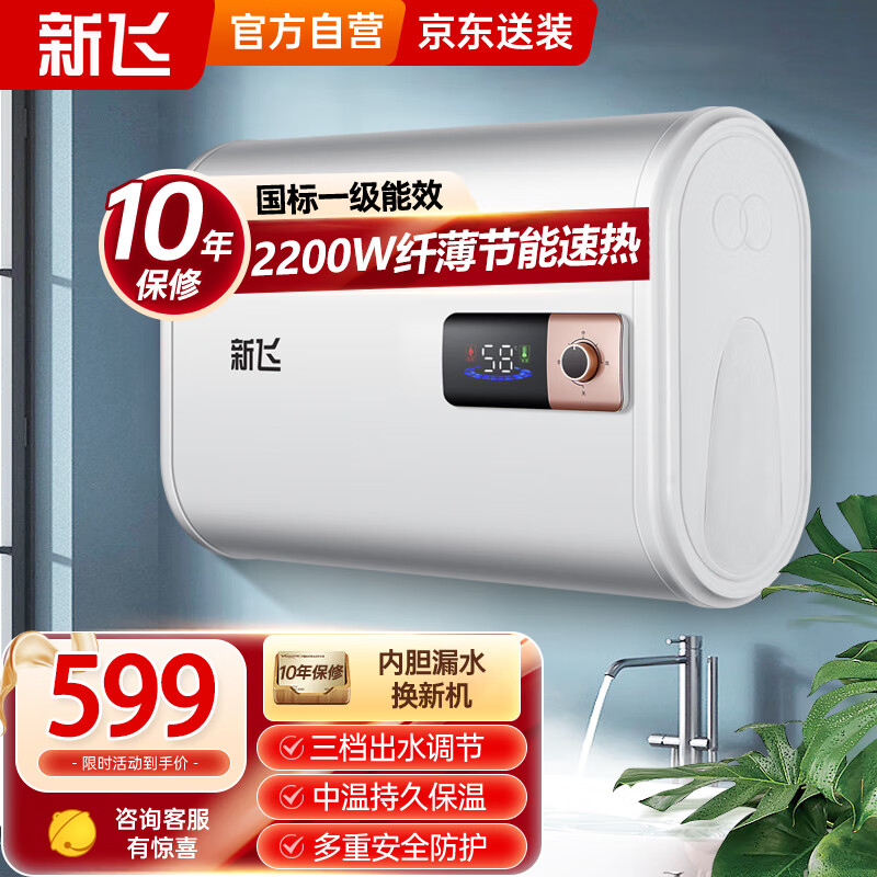 新飞储水式电热水器扁桶50升一级能效2200W节能出水断电双胆速热家用卫生间洗澡恒温租房DSZF-B208-50L价格:499.00元!