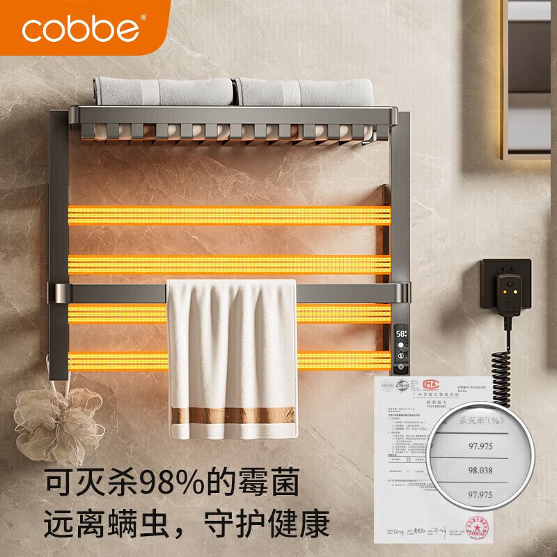 卡贝(cobbe)枪灰电热毛巾架太空铝智能卫生间免打孔加热烘干浴巾架浴室置物架价格:608.00元!