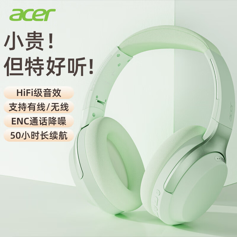 宏碁(acer)OHR205 头戴式无线蓝牙耳机 游戏音乐运动长续航降噪耳机 苹果华为小米手机通用 绿色价格:129.00元!