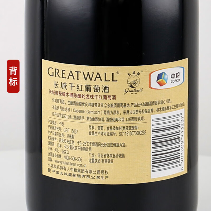 商品名称:长城长城(GreatWall)红酒窖酿3精选解百纳干红葡萄酒750ml*6瓶整箱装