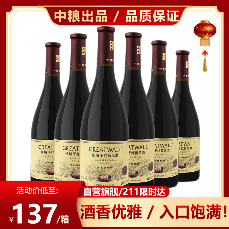 长城(GreatWall)红酒 御秘橡木桶蛇龙珠干红葡萄酒750ML*6瓶整箱装(原箱包装)价格:137.00元!