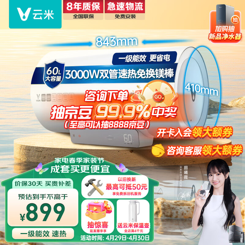 云米(VIOMI)电热水器3000W免换镁棒双管电热水器60升家用APP智控 一级能效VEW6010【速热健康洗】价格:899.00元!