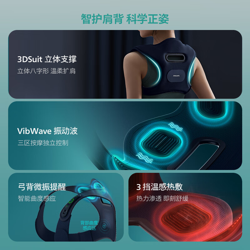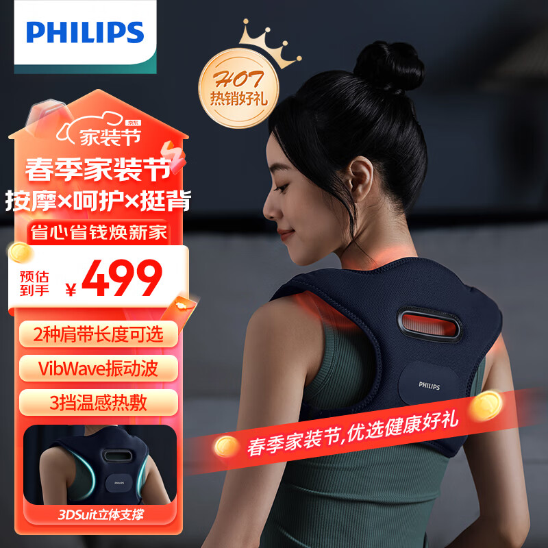 飞利浦(PHILIPS)背带按摩器肩颈按摩仪 儿童成人坐姿矫正驼背提醒扩肩挺背热敷肩背隐形肩背带仪3601B M码价格:499.00元!
