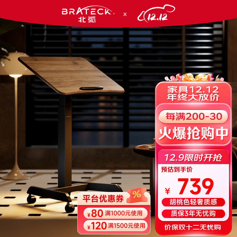 Brateck升降桌 北弧笔记本电脑桌 可移动办公书桌 站立办公升降台K151棕价格:859.00元!
