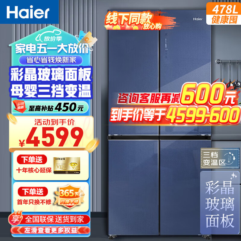 海尔(Haier)478升十字对开门冰箱四开门一级能效变频母婴空间三档变温大容量干湿分储BCD-478WGHTD5DB1价格:4399.00元!