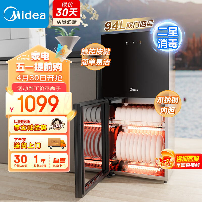 美的(Midea)消毒柜家用 立式 厨房餐具碗柜碗筷茶杯茶具 94L四层大容量智能 高温二 XC61价格:1099.00元!