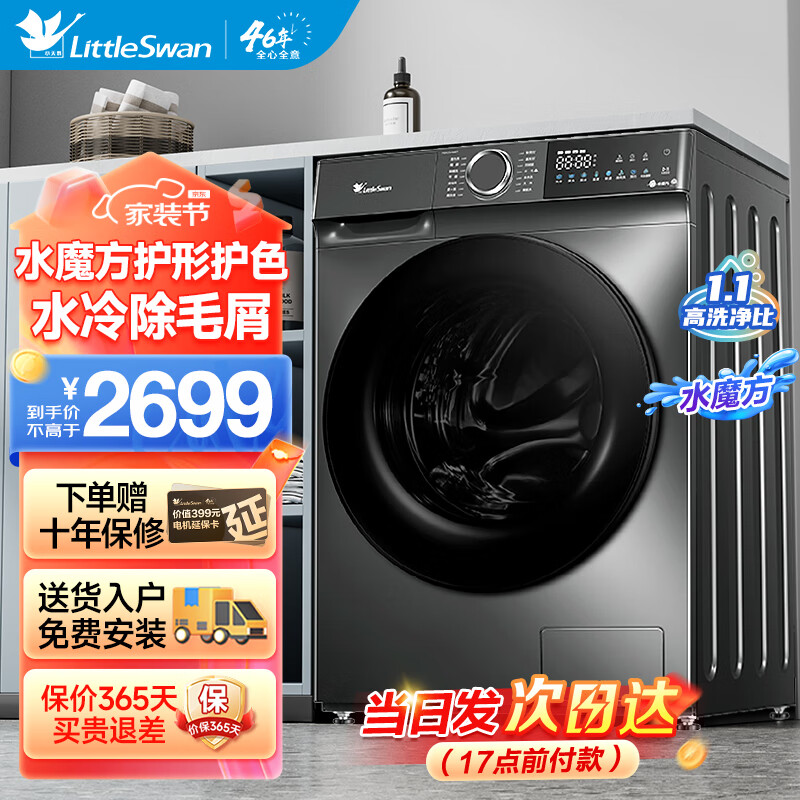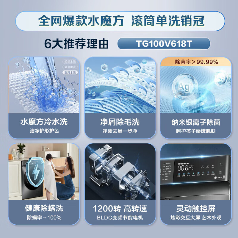 小天鹅(LittleSwan)水魔方10公斤全自动滚筒洗衣机 炫彩大屏 变频智能 银离子除菌除螨1.1高洗净比 TG100V618T价格:2599.00元!