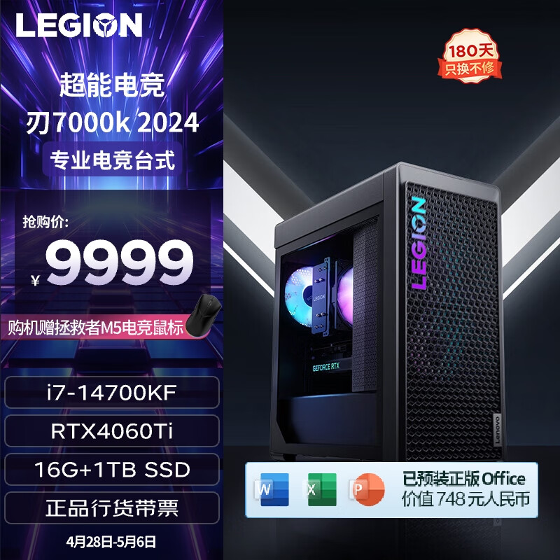 联想(Lenovo)拯救者刃7000K 2024游戏电竞电脑主机(酷睿14代i7-14700KF RTX4060Ti 8GB显卡 16G 1T SSD)价格:9999.00元!