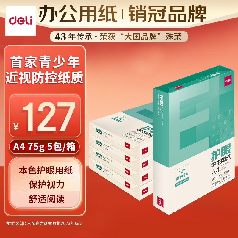 得力(deli)本色护眼A4打印纸 75g500张*5包一箱 学生作业草稿纸 双面低白 整箱2500张 ZF6002【护眼本色】价格:127.00元!