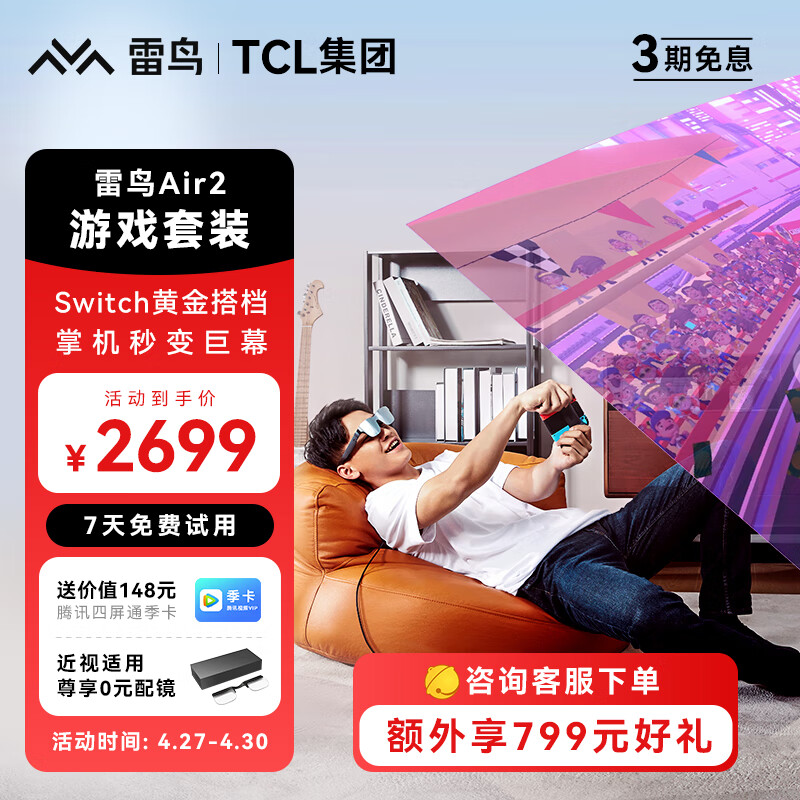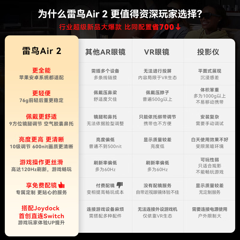 雷鸟Air2 智能AR眼镜 高清巨幕观影眼镜 120Hz高刷 JoyDock掌机巨幕 vision pro平替Switch专属价格:3099.00元!
