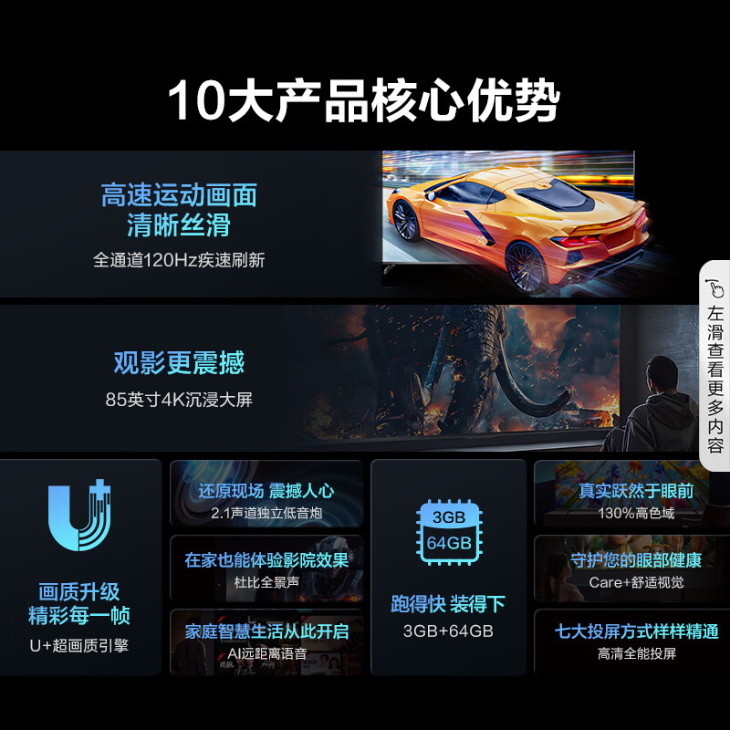 海信电视E3N 85英寸 全通道120Hz高刷 U+超画质引擎 独立低音炮 3GB+64GB 液晶游戏智慧屏电视价格:5199.00元!