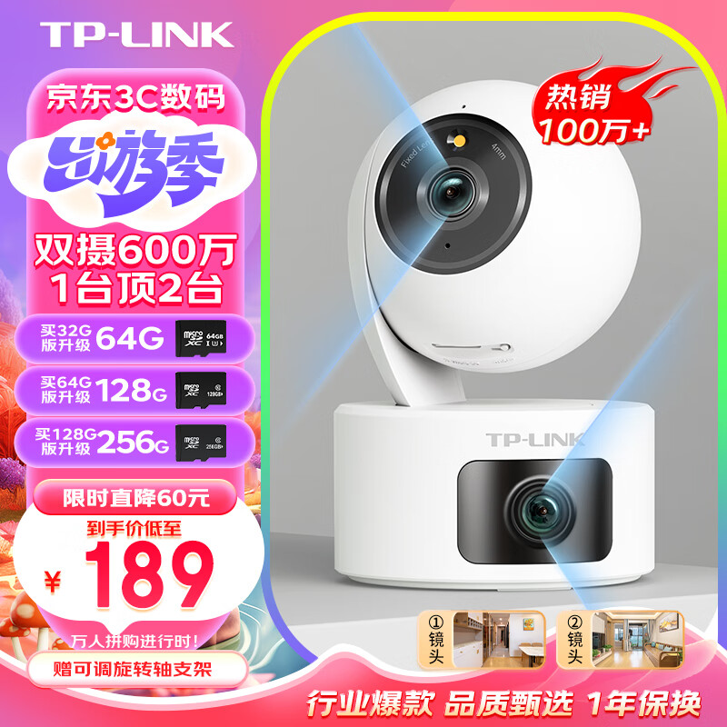 TP-link双摄600万监控摄像头家用监控器360度无死角带夜视全景无线家庭室内tplink远程婴儿看护宝宝监护价格:189.00元!