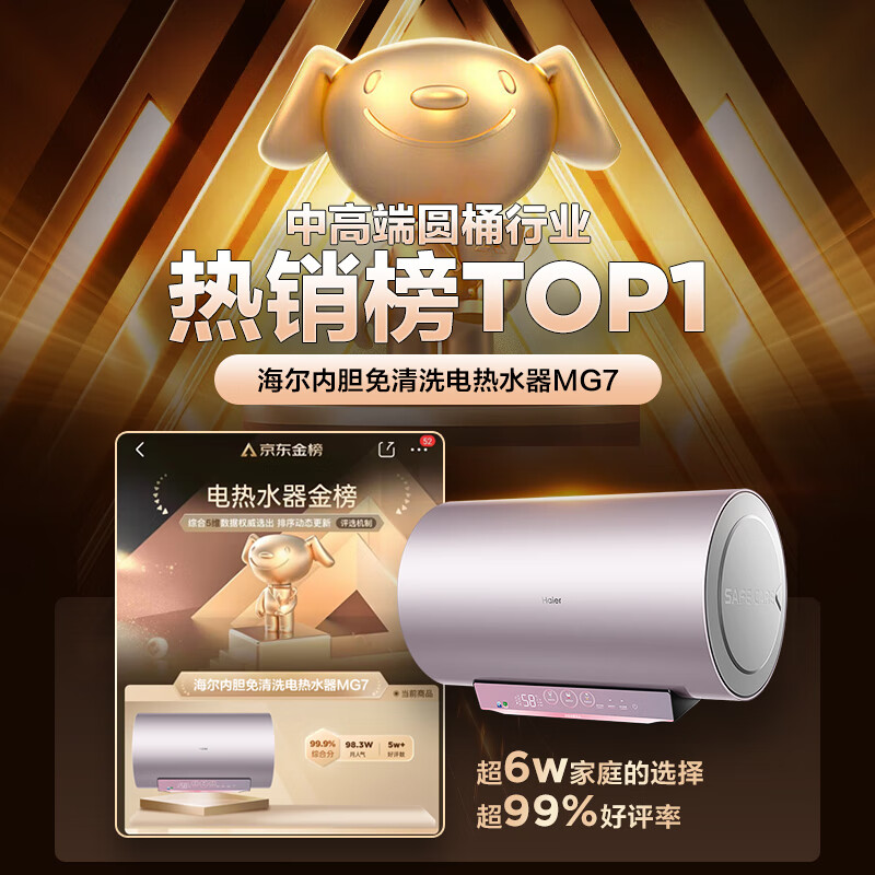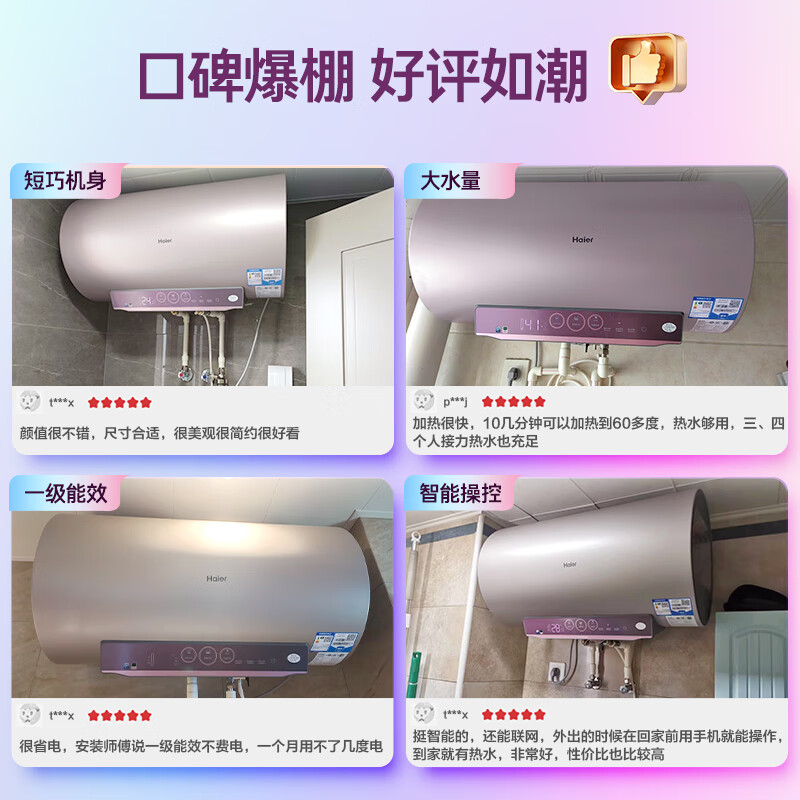 海尔(Haier)60升【金刚无缝胆】美肤净水洗家用储水式电热水器 3300W变频大功率速热 免换镁棒 EC6002-MG7(U1)价格:1649.00元!