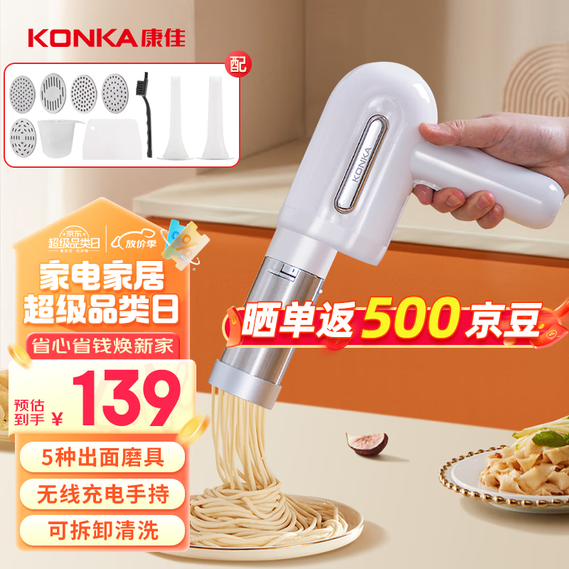 康佳(KONKA)面条机 家用压面机 手持压面枪 小型电动自动不锈钢压面条机 KMTJ-0401-W价格:139.00元!